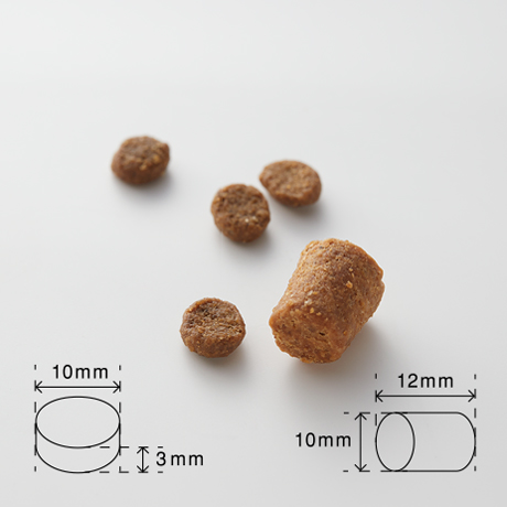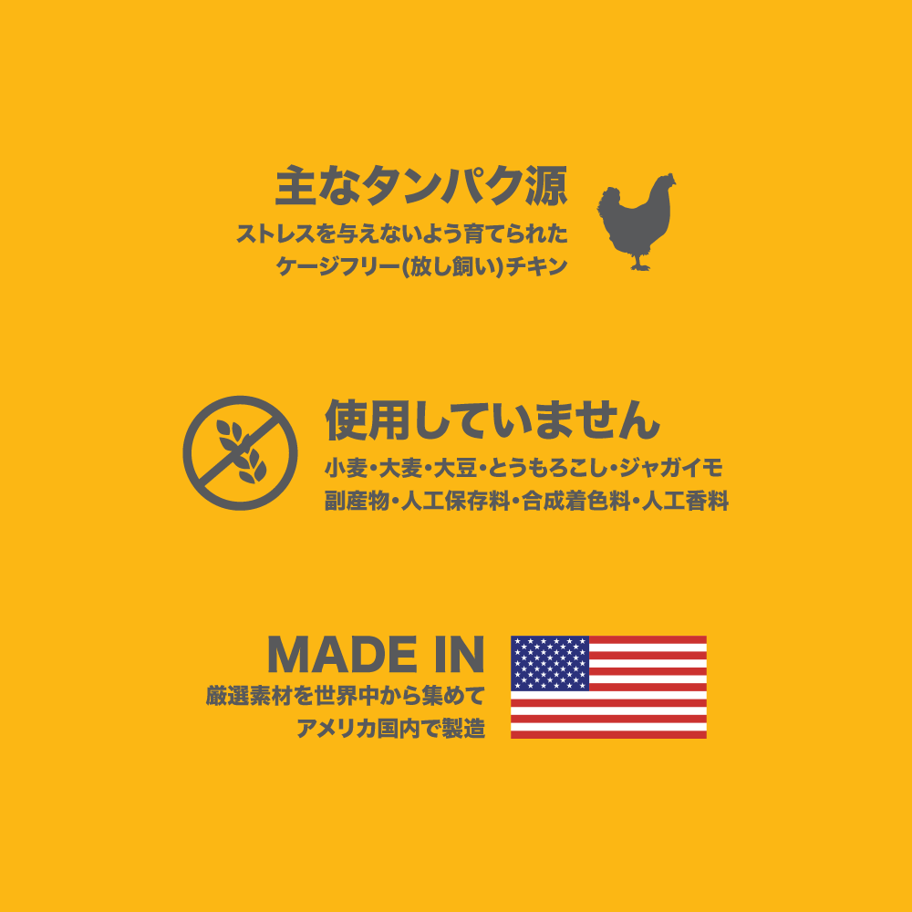| 素材 | チキン、チキンミール、ターキーミール、メンヘーデンフィッシュミール、エンドウ豆、チキン脂肪(混合トコフェロールとクエン酸で保存)、タピオカ、 フリーズドライチキン、ナチュラルフレーバー、フリーズドライチキンレバー、ドライトマトポマス、カボチャの種、フリーズドライチキンハート、 モンモリロナイトクレイ、ニンジン、リンゴ、クランベリー、塩化コリン、塩、ビタミン(ビタミン E サプリメント、L- アスコルビル -2- ポリリン酸塩、 ナイアシンサプリメント、ビタミン A サプリメント、チアミン硝酸塩、d- パントテン酸カルシウム、リボフラビンサプリメント、ピリドキシン塩酸塩、 ビタミン B12 サプリメント、葉酸、ビタミン D3 サプリメント、ビオチン)、ミネラル(亜鉛タンパク質、鉄タンパク質、銅タンパク質、マンガン タンパク質、亜セレン酸ナトリウム、エチレンジアミン)、タウリン、乾燥昆布、サーモンオイル、ブルーベリー、乾燥乳酸菌バチルス・コアギュランス、 ローズマリーエキス | ||||||||||||||||||||||||||||||||