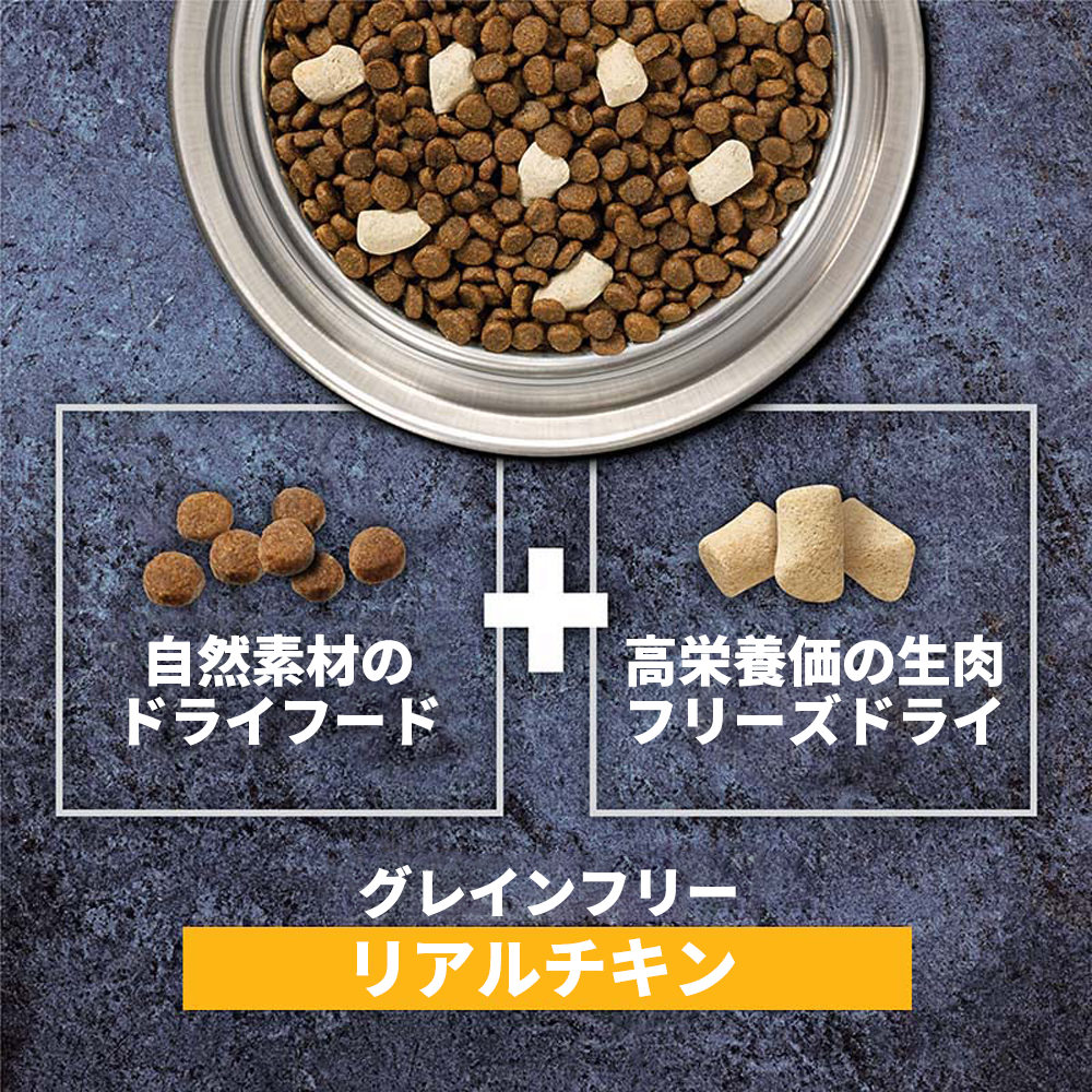 高たんぱくドライフードにraw(フリーズドライ)をミックスした総合栄養食。月齢3か月以上 オールライフステージ対応。