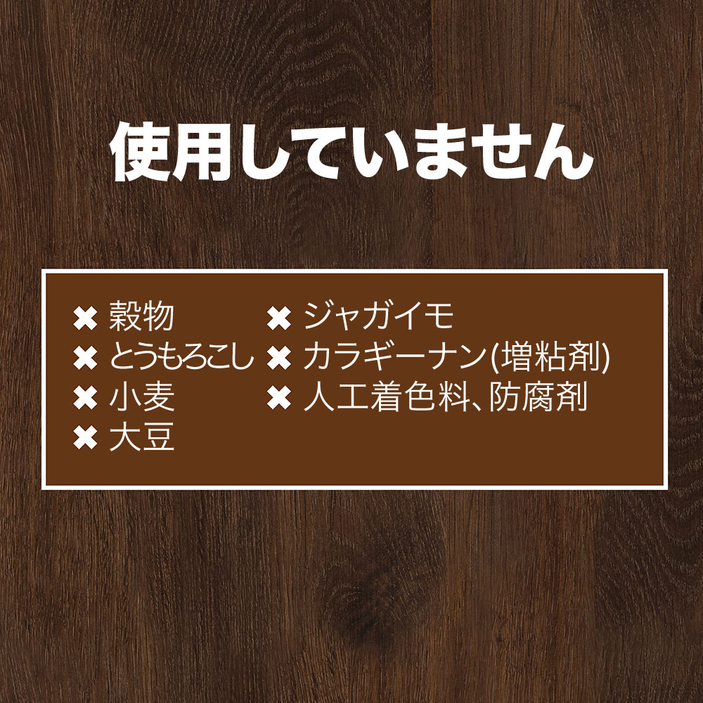 ● 不使用:穀物・トウモロコシ・小麦・大豆・副産物・ジャガイモ・ 人工着色料または保存料