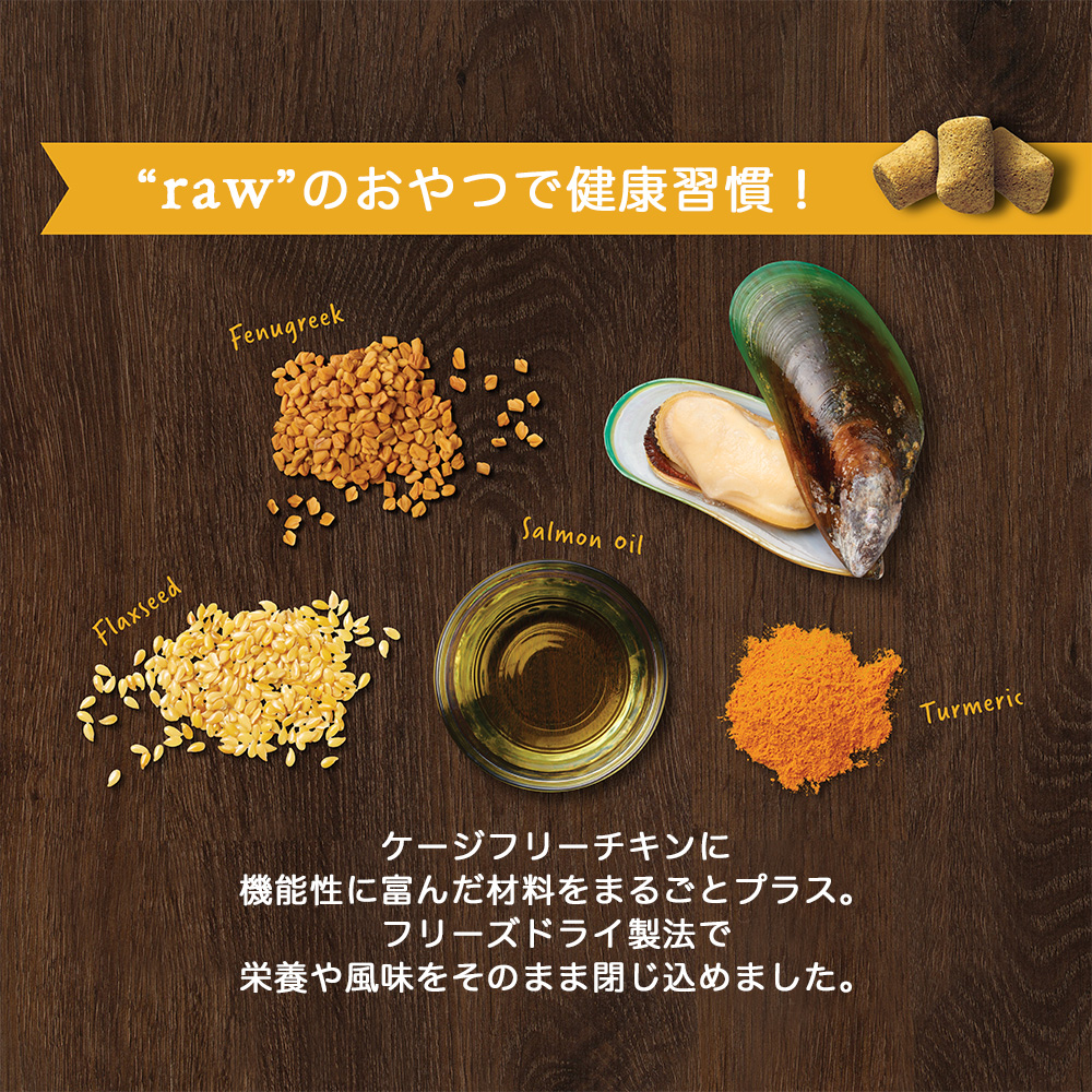 “raw(生)”の食材の栄養素をしっかり保管した栄養補助食。腰や関節などの運動機能をサポート。