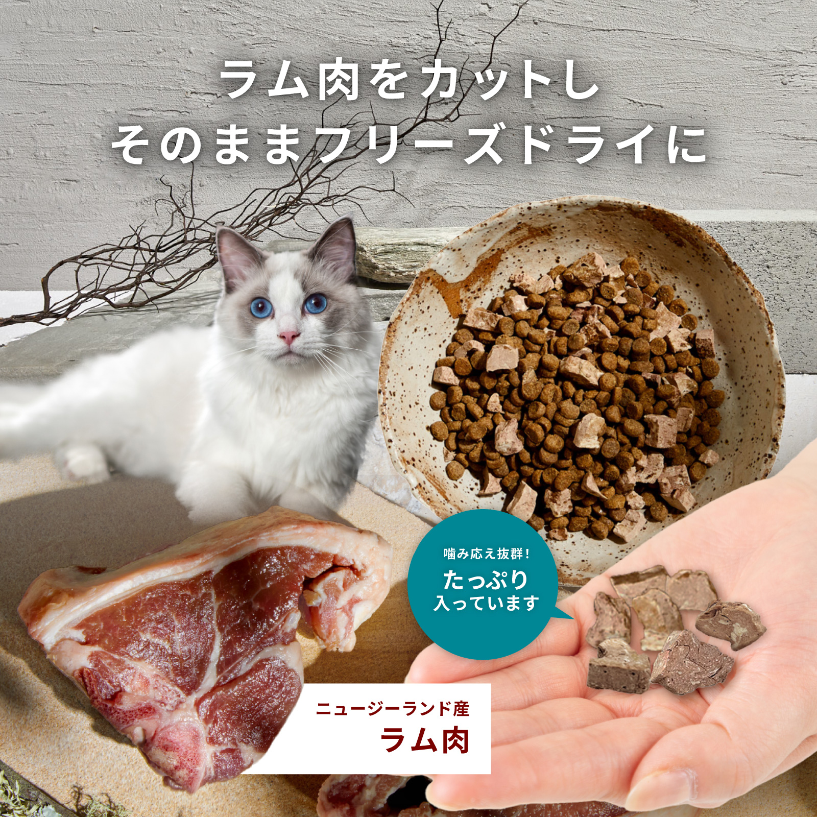 【ラム肉(フリーズドライ)】ニュージーランド産ラム肉を加熱せず美味しさと栄養そのままのフリーズドライに。愛猫が本能的に求める栄養をしっかり供給