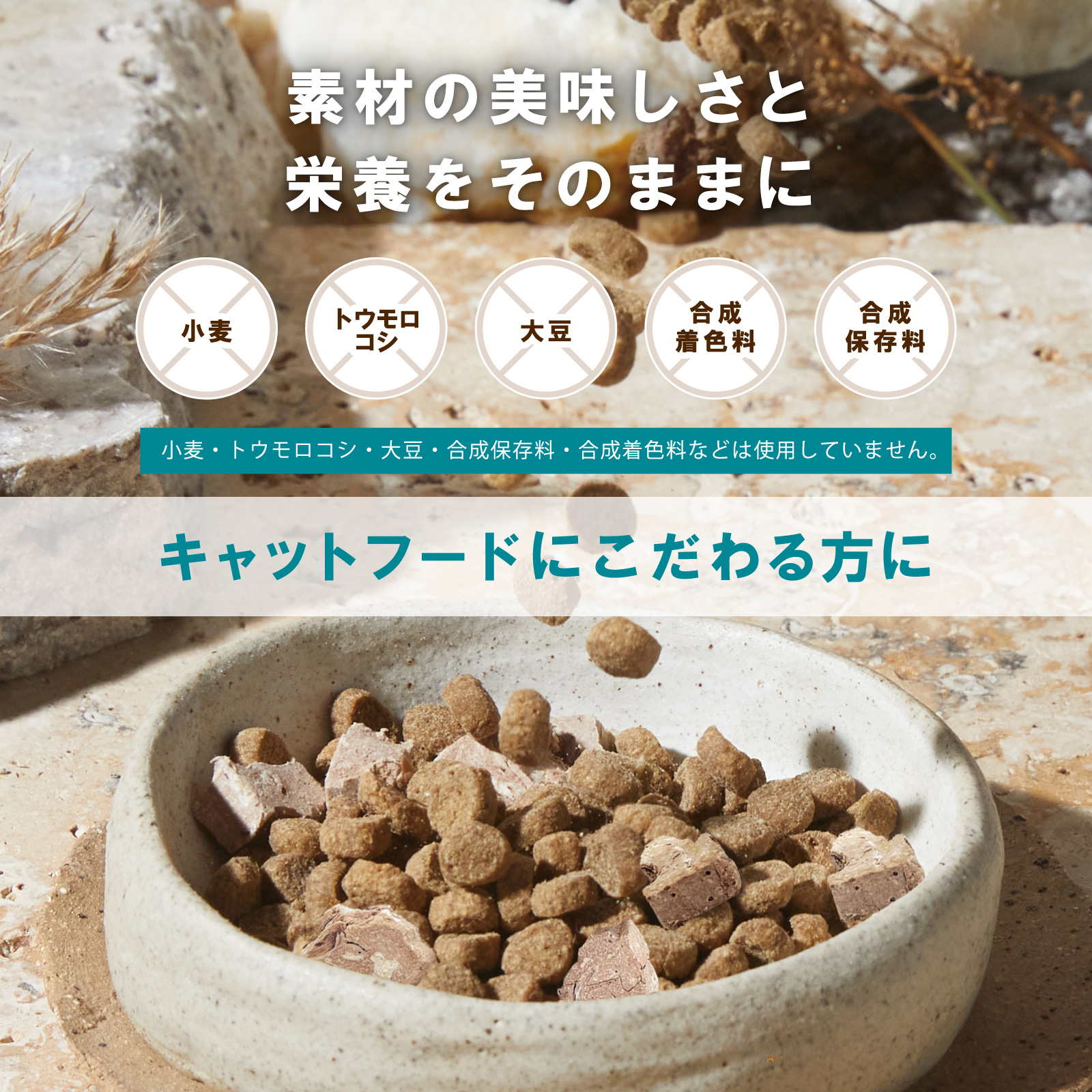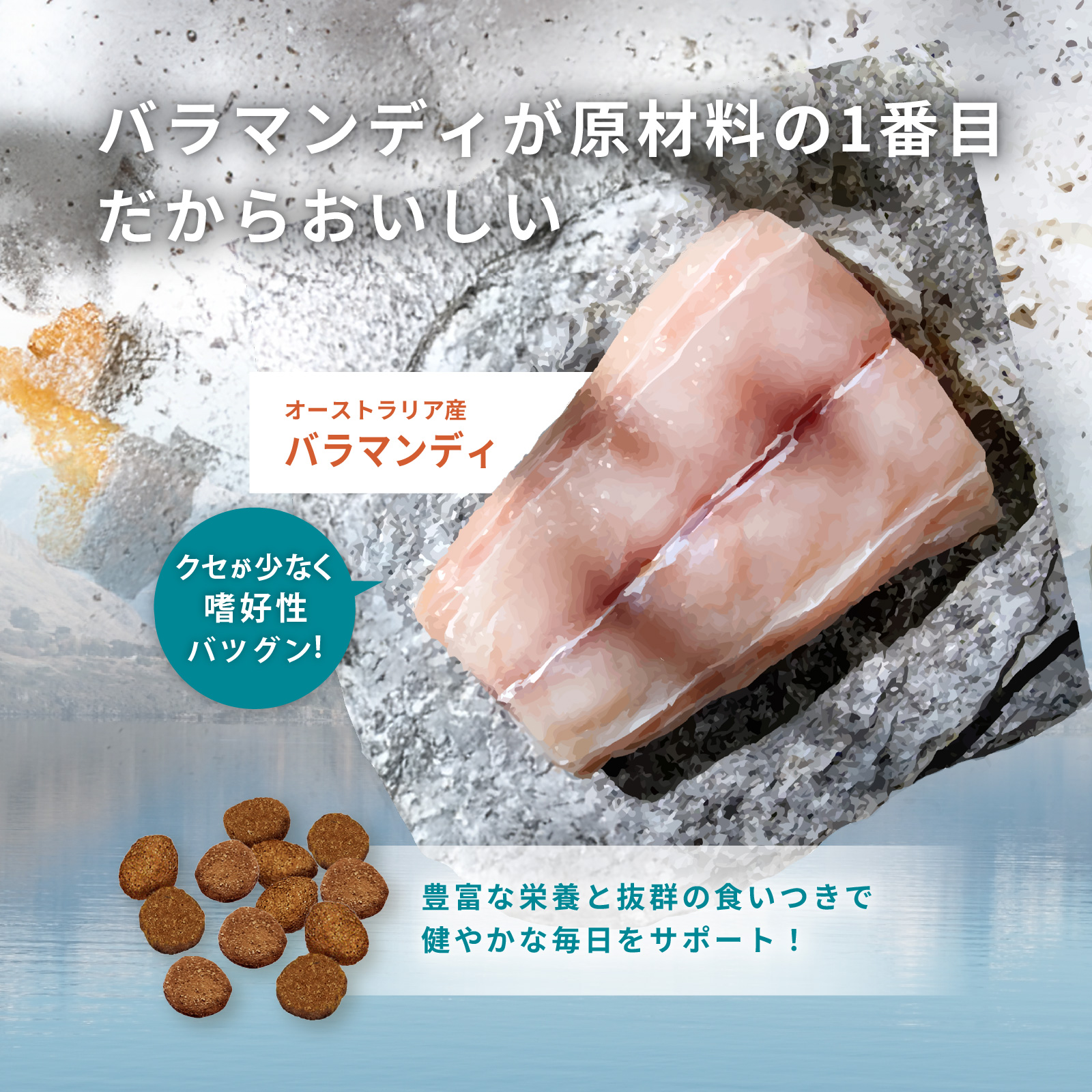 | 素材 | バラマンディ(白身魚)、サーモンミール、フィッシュミール、動物性油脂、サーディンミール、レンズ豆、ヒヨコ豆粉、エンドウ豆、フリーズドライラム、ツナミール、エンドウ豆プロテイン、ソラ豆プロテイン、タピオカデンプン、ビーフ&フィッシュエキス、ビートパルプ、セルロース、アルファルファ、チコリ、ユッカエキス、ビタミン類(A、B1、B2、B6、B12、D3、E、K、コリン、ビオチン、パントテン酸、葉酸、ナイアシン)、ミネラル類(ナトリウム、カリウム、銅、カルシウム、鉄、マンガン、セレン、亜鉛)、アミノ酸類(タウリン、メチオニン)、酸化防止剤(クエン酸、ミックストコフェロール、ローズマリーエキス) |